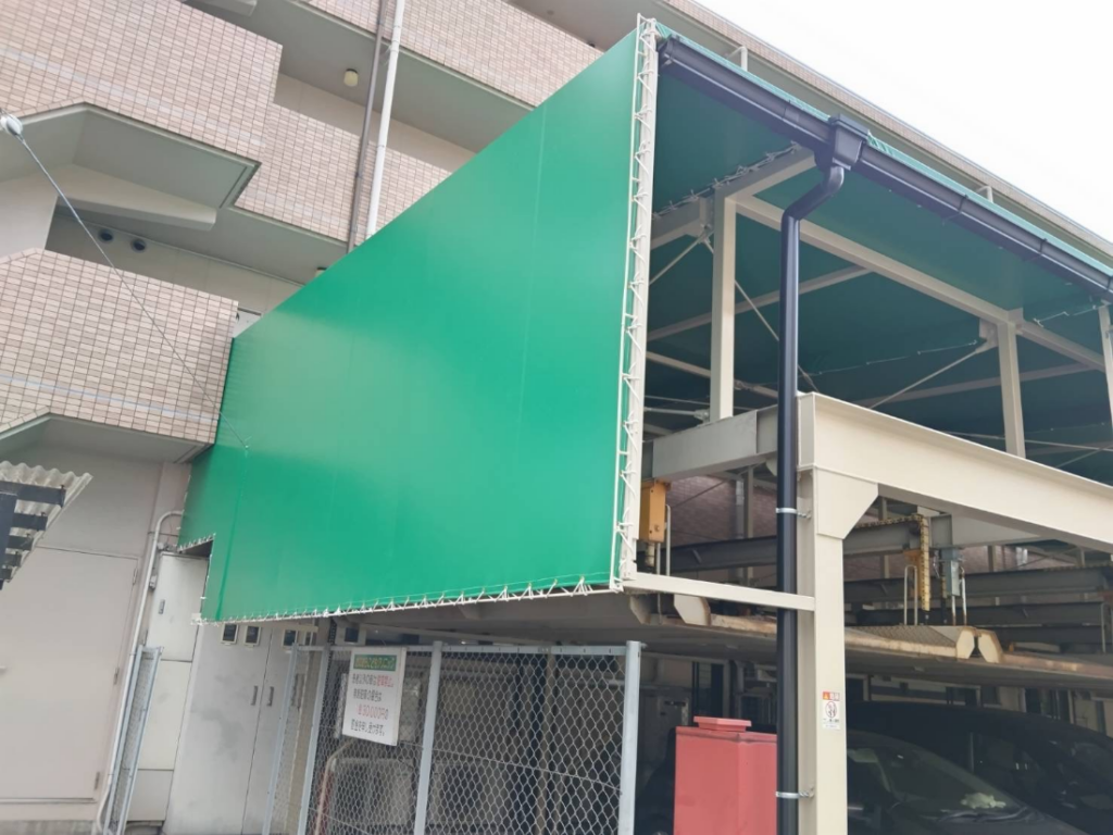 坂東テント工芸では、現地調査からシート製作、取付工事まで一貫して対応しております。マンションや駐車場設備に関する施工もお気軽にご相談ください。